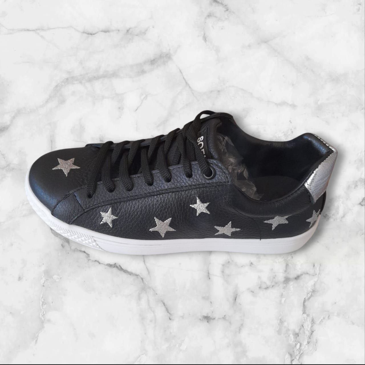 Zapatilla en flowter negro con estrellas plateadas.