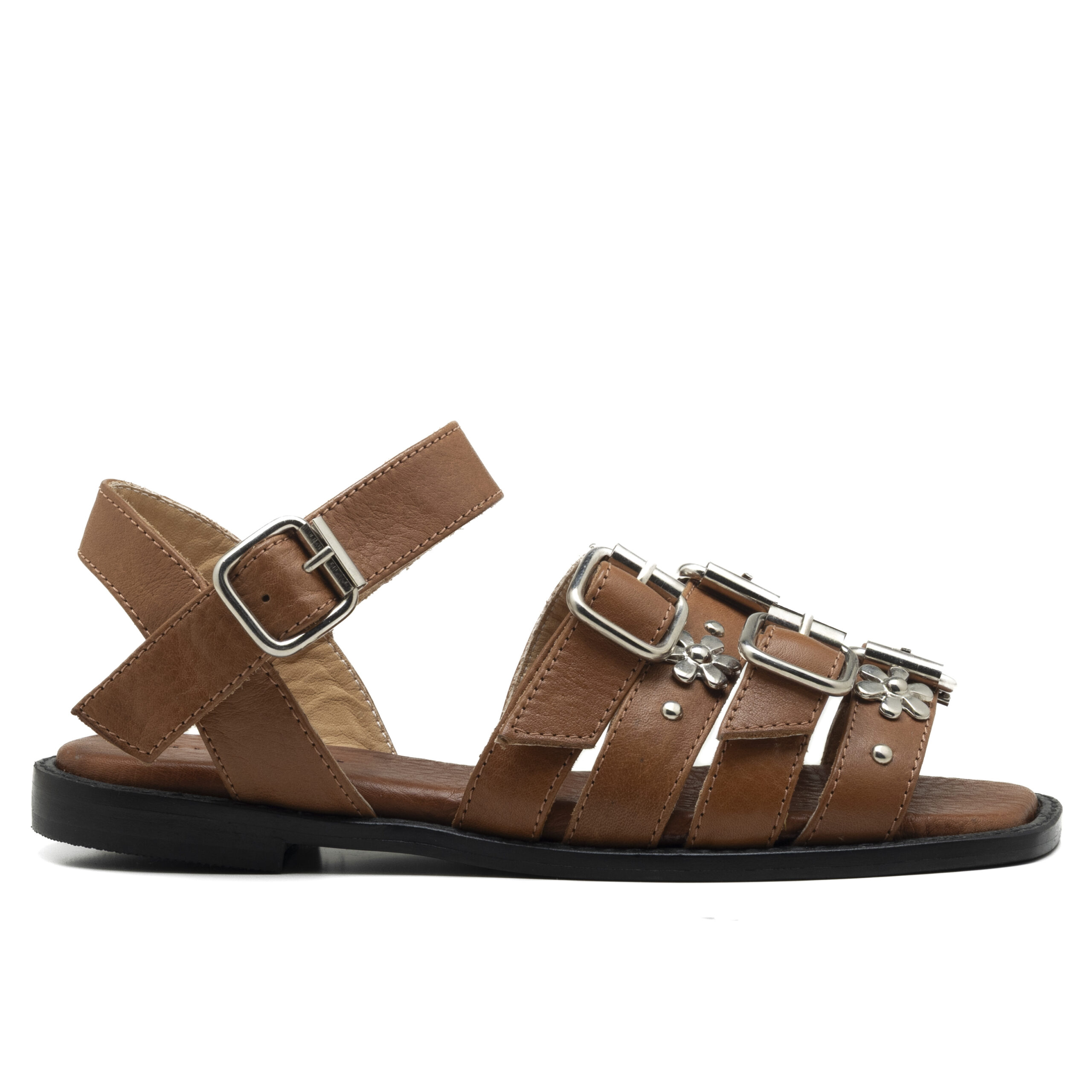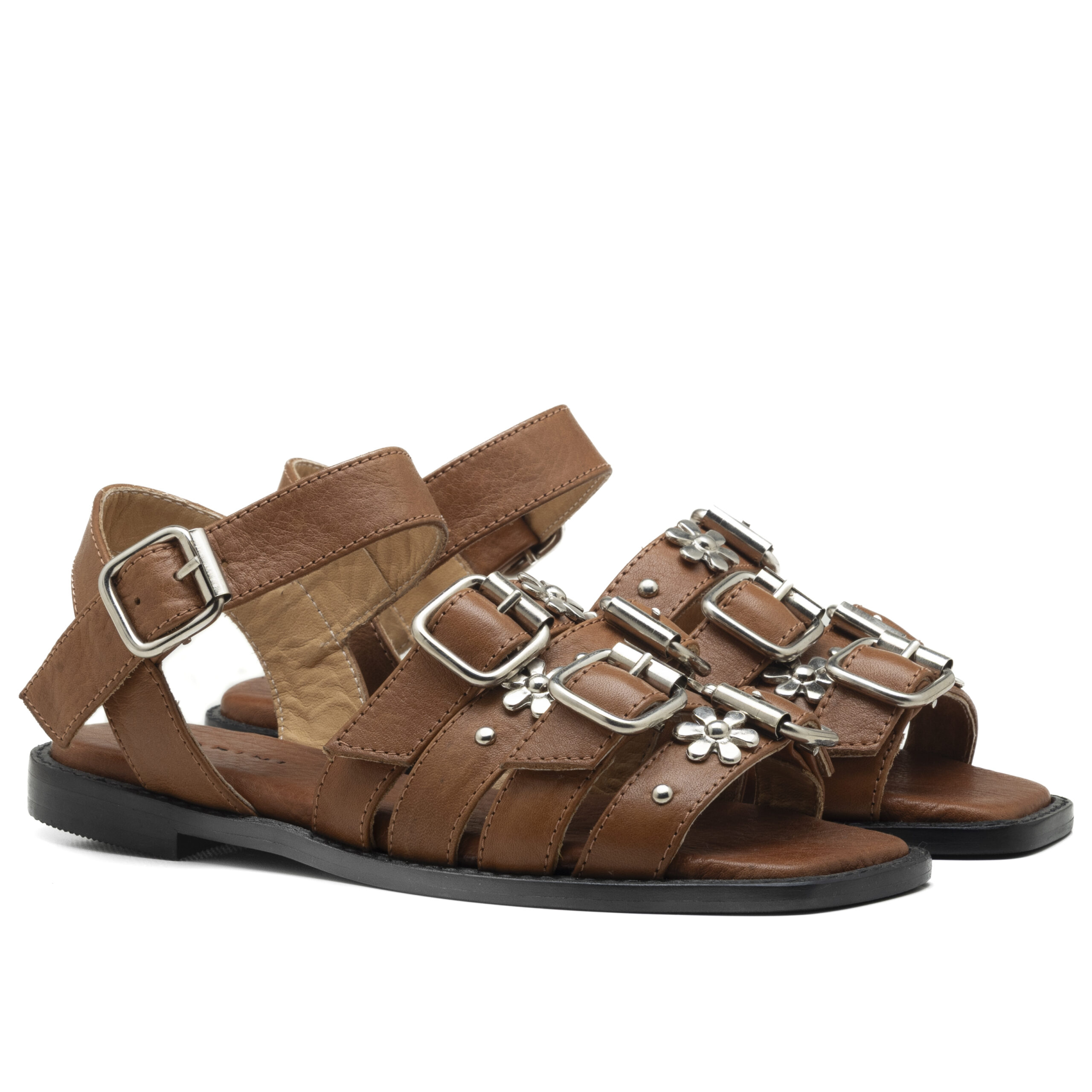 Sandalia marrón con múltiples hebillas y flores metálicas