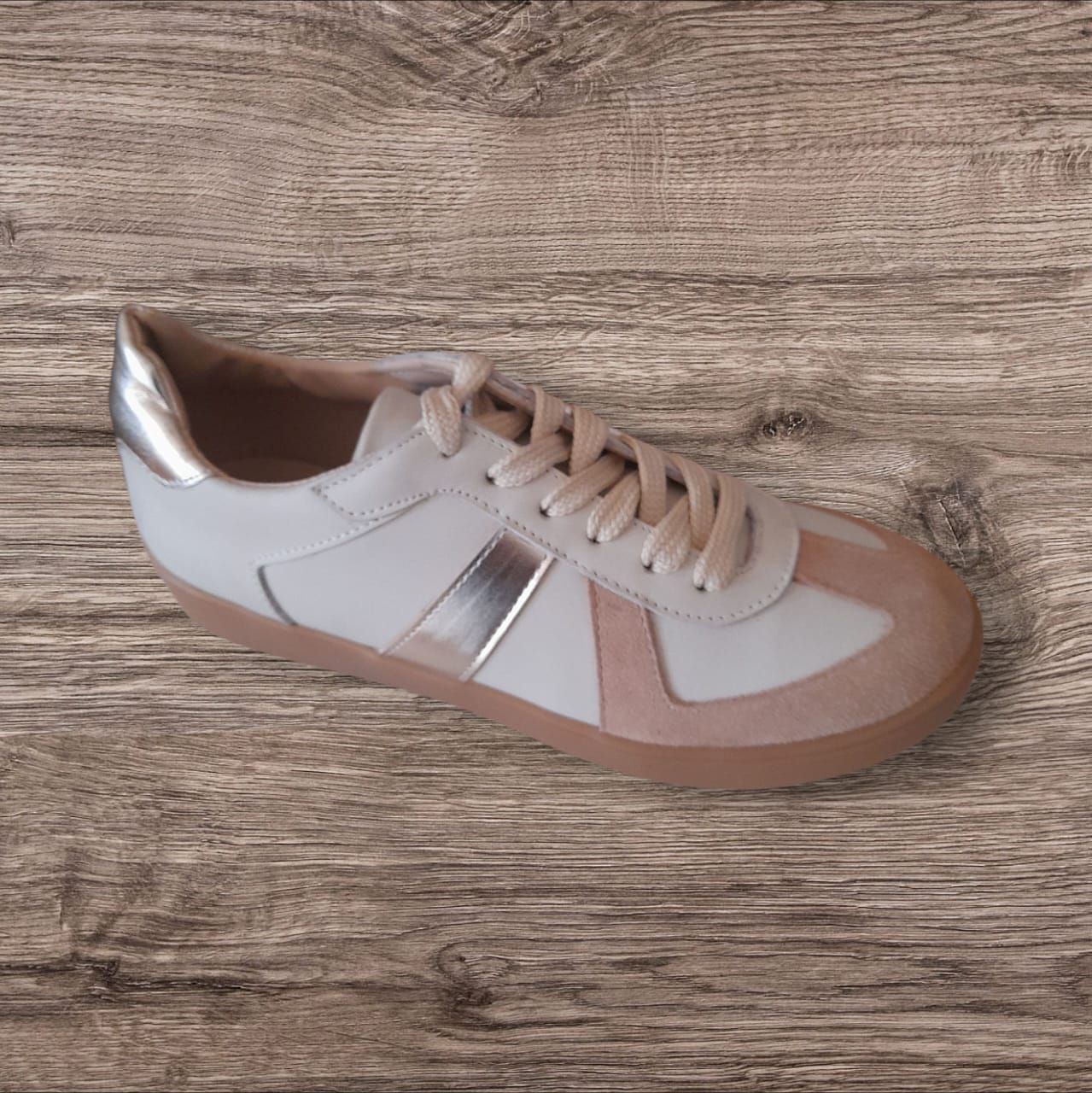 Zapatilla en napa natural con charol plateado y puntera gamuzada.