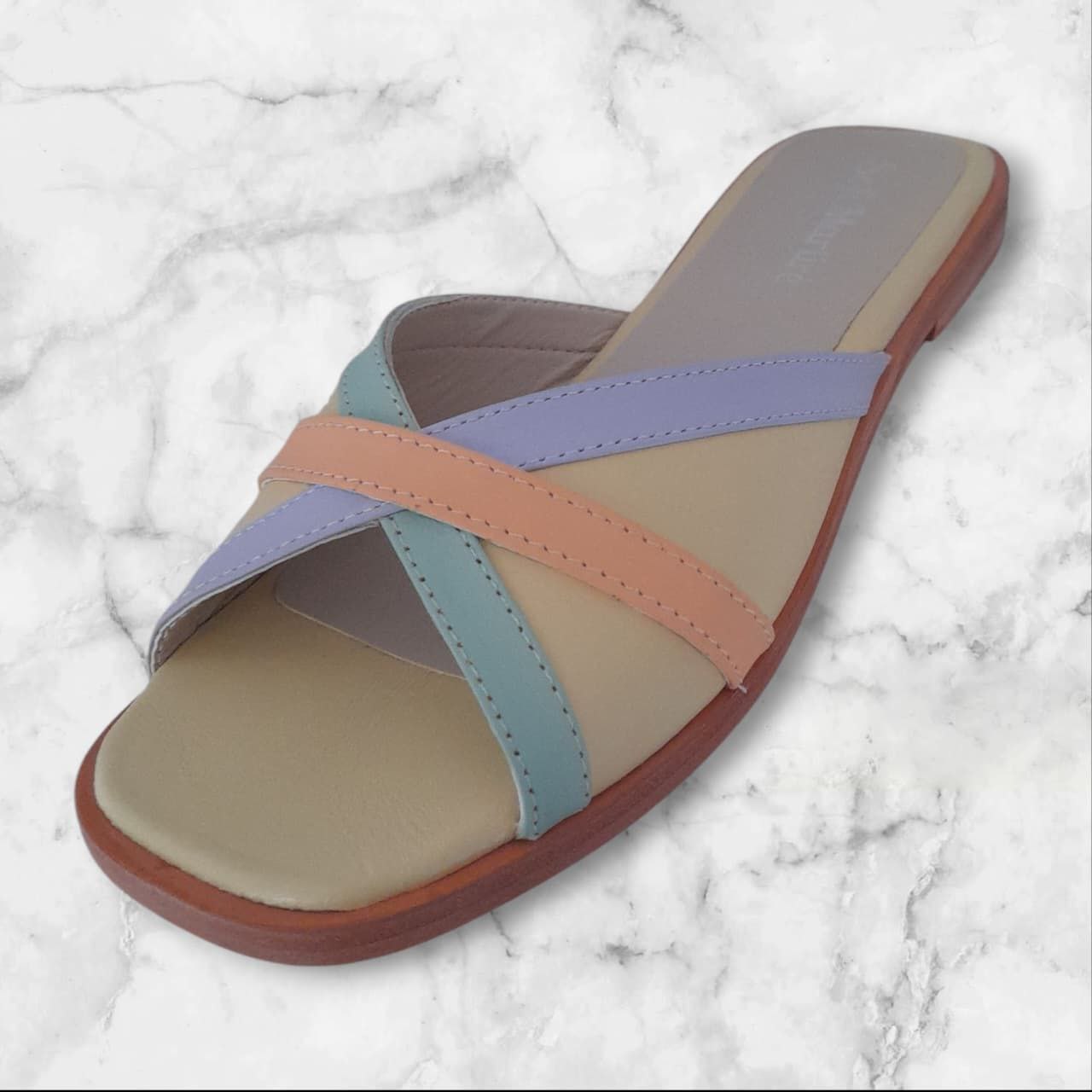 Sandalia en napa plana con tiras cruzadas en tonos pasteles. Alegre, fresca y juvenil para looks veraniegos.