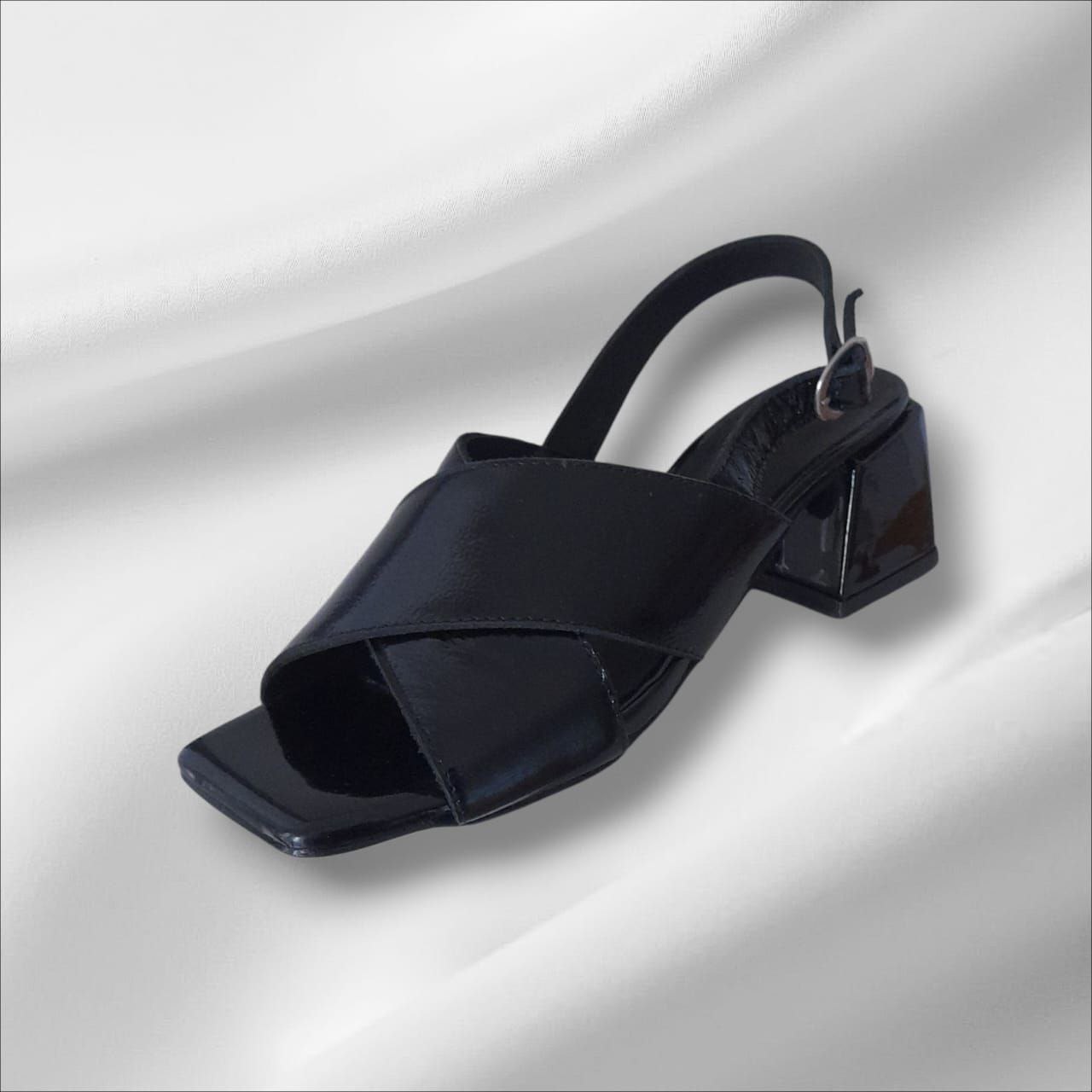 Sandalia en charol de taco medio, diseño cruzado en charol, pulsera en talón con hebilla.