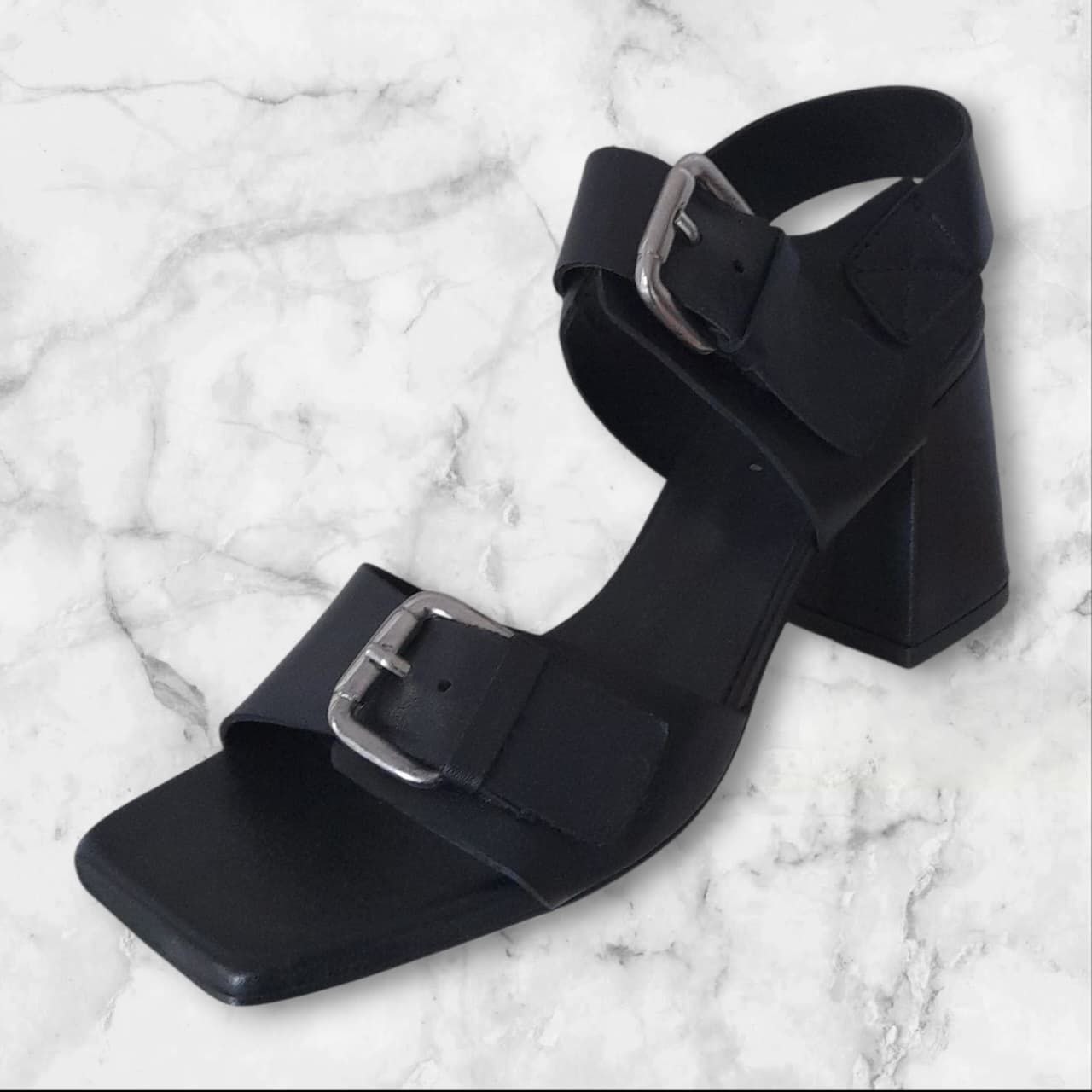 Sandalia en napa con taco ancho, doble tira con hebillas metálicas. Moderna, firme y cómoda, ideal para un look urbano con personalidad.