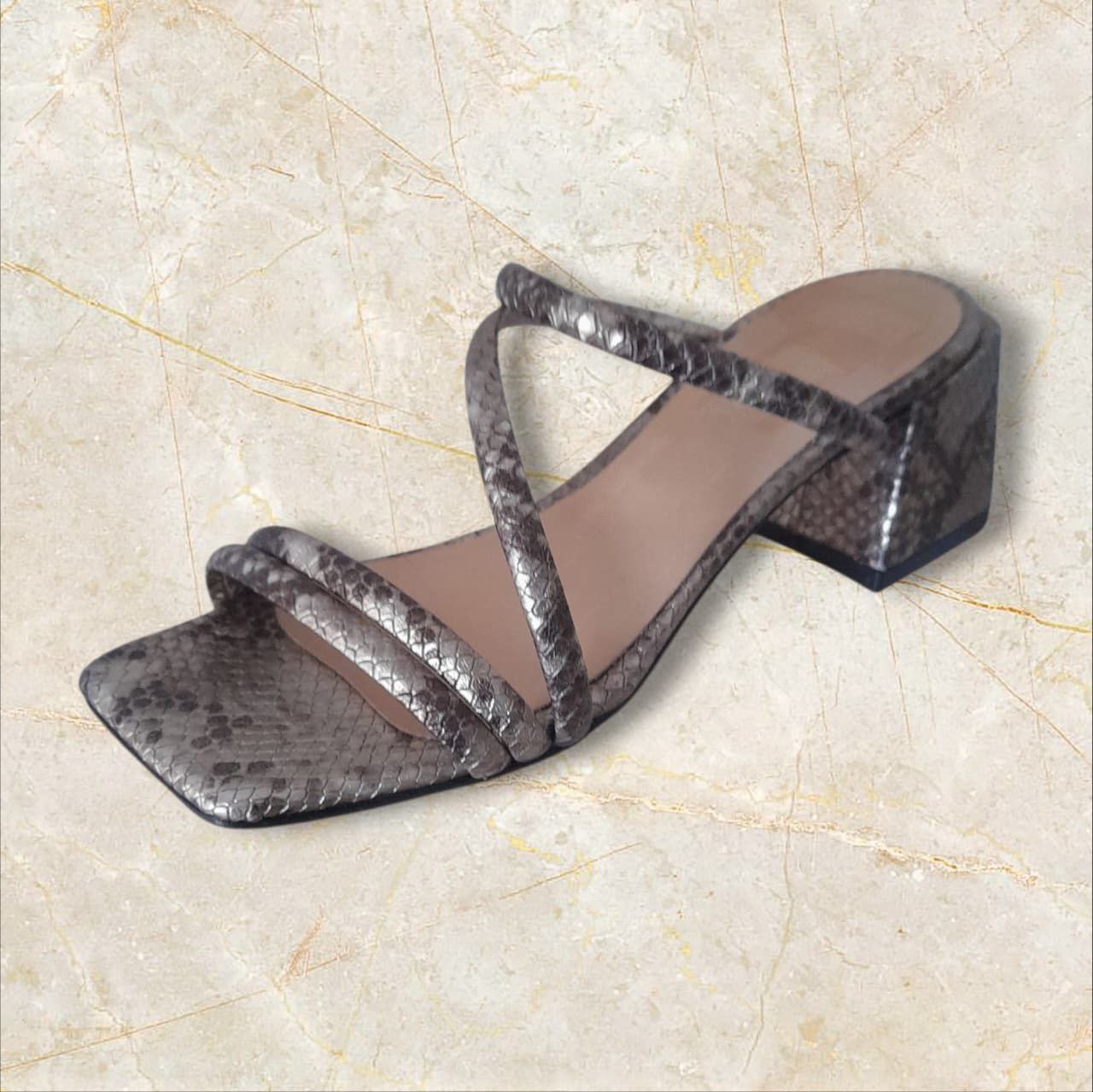 Sandalia en vibora metalizada con taco medio y tiras finas cruzadas en cuero reptilado. Sofisticada, con un toque moderno y distinguido.